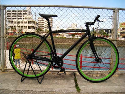 ブレーキ面ありの緑、リアは黒リムに紫ニップルxグラコン黒