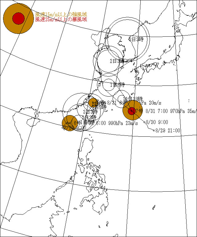 2010年8月31日4時30分発表 強い台風7号は、31日3時には南大東島の南西約180kmにあって、北西へ毎時20kmで進んでいます。中心気圧は970hPa、中心付近の最大風速は 35m/sです。この台風は、31日15時には名護市付近に進み、1日3時には東シナ海付近へ達するでしょう。2日3時には黄海付近へ進み、3日3時には朝鮮半島付近へ達する見込みです。台風周辺海域および進路にあたる海域は、シケ~大シケとなるため厳重な警戒が必要です。次回の台風情報は、8月31日 10時30分の予定です。